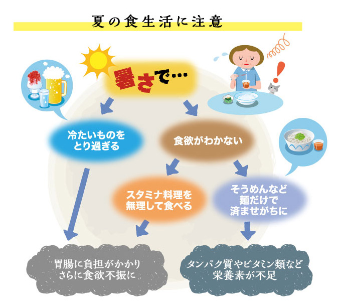 暑い夏の食事は、ついつい、喉を通りやすい麺類だけで済ませてしまったり、冷たいものばかりになったりしがちです。しかしそんな食事を続けていると、必要な栄養素がきちんととれず、体力の低下をまねきかねません。冷たい食事は胃腸への負担を大きくし、余計に食欲がなくなってしまう可能性もあります。