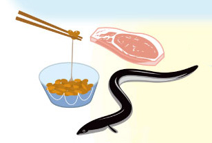 - 炭水化物に多く含まれる糖質をエネルギーに変えるビタミンB1を積極的にとりましょう。豚肉、ウナギ、レバー、豆類、納豆、玄米などに多く含まれています。