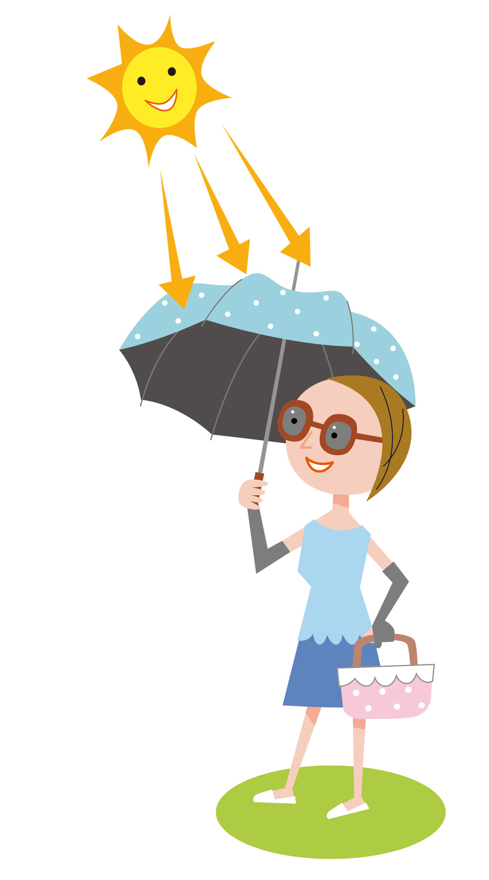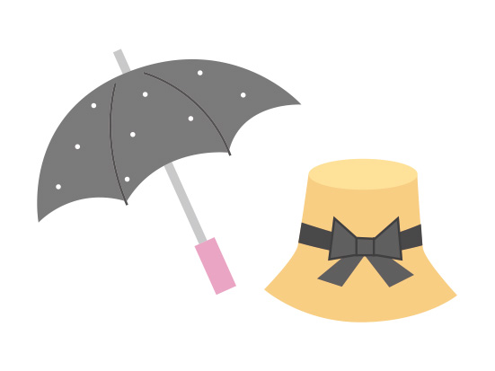 - 直接降り注ぐ紫外線に効果あり。ツバの広い帽子を選び、日傘の柄は短めに持つと良いでしょう。