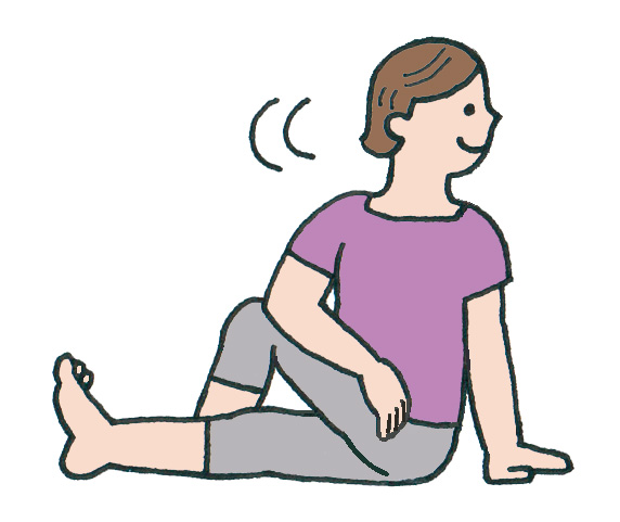 - 足を伸ばして座り、左ひざを右足にクロスさせ、上半身を左側にねじる。左右交互に行う
