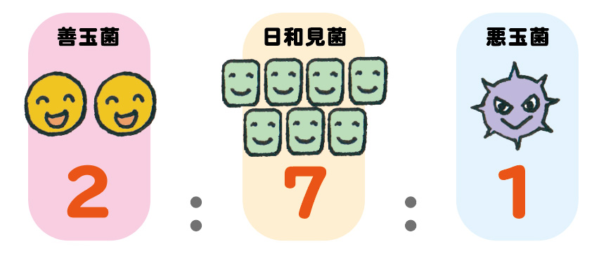 腸内細菌は、善玉菌、悪玉菌、日和見菌というグループに分かれ、そのバランスが最も良いのは善玉菌20%、悪玉菌10%、日和見菌70%の割合といわれています。