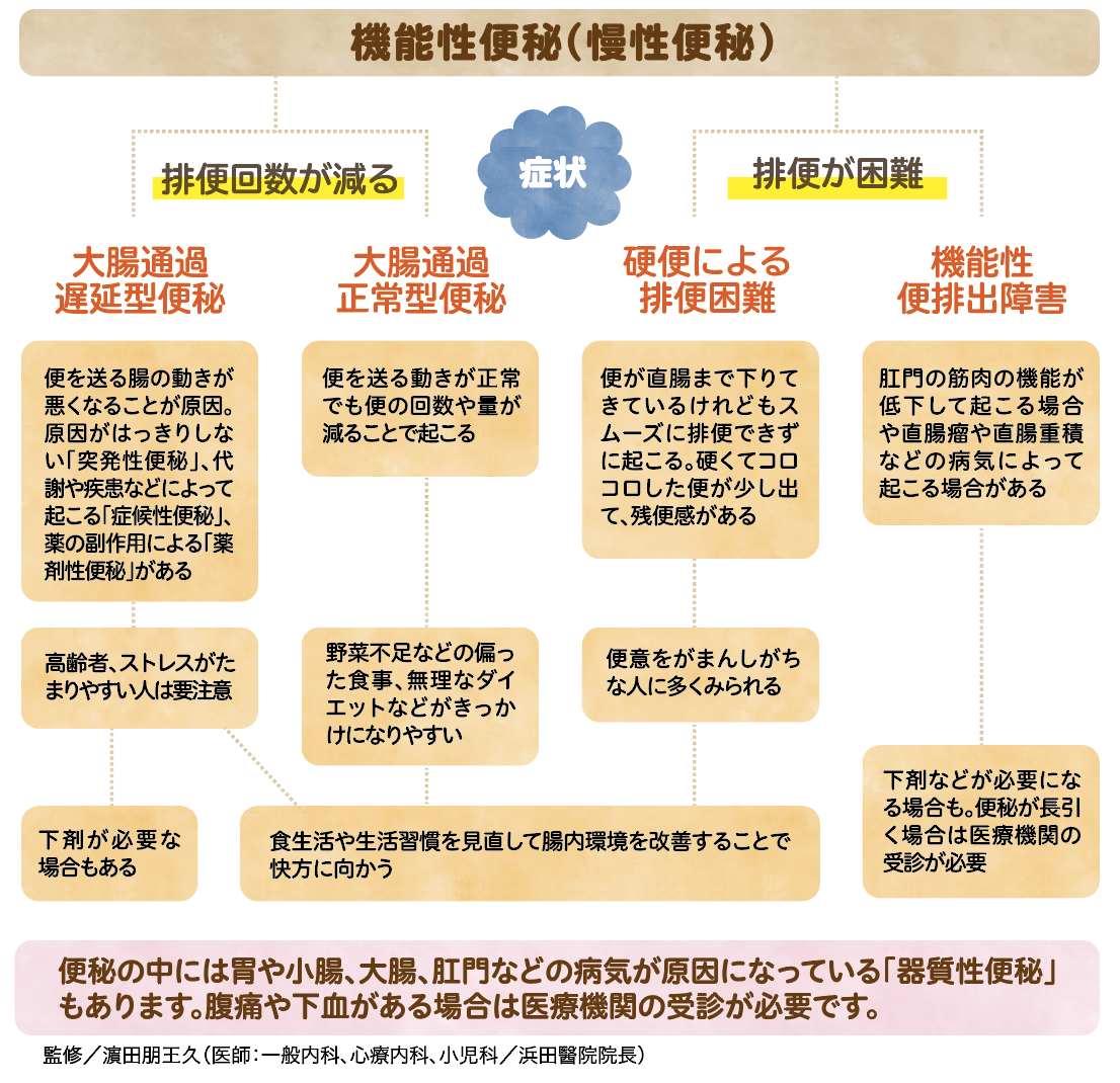 便秘にはいくつかのタイプがありますが、一般的に「便秘」と呼ばれているのは、食生活や生活習慣が原因となっているタイプの「機能性便秘(慢性便秘)」です。便秘に悩んでいる場合は、自分がどのタイプかをチェックしてみましょう。