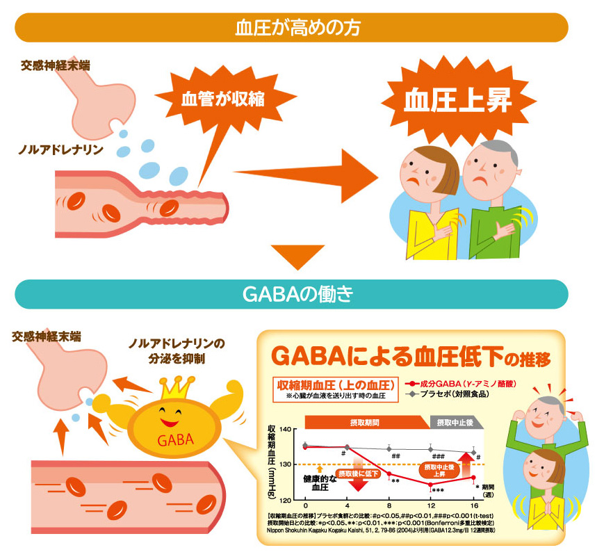 GABA(ギャバ)が注目を集めているもう一つの理由が、血圧を下げる作用があること。血管を収縮させる作用のある神経伝達物質ノルアドレナリンの分泌を抑えることで、血管を弛緩させ血圧を下げます。また、腎臓の機能をサポートして、高血圧の原因となる塩分の排出を促すことも報告されています。