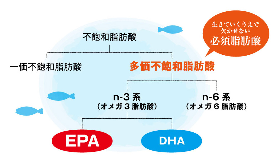EPAは、DHAと同じn‐3系の不飽和脂肪酸で「オメガ3脂肪酸」とも呼ばれています。私たちが生きていくうえで欠かすことのできない重要な栄養素なのですが、体内では作ることができないため、食べ物から摂取する必要があります。