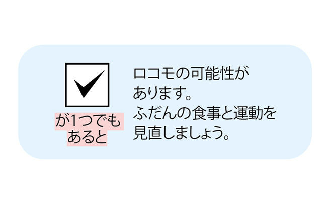 ロコモはいつのまにか進行していて自分では気付かない場合が少なくありません。