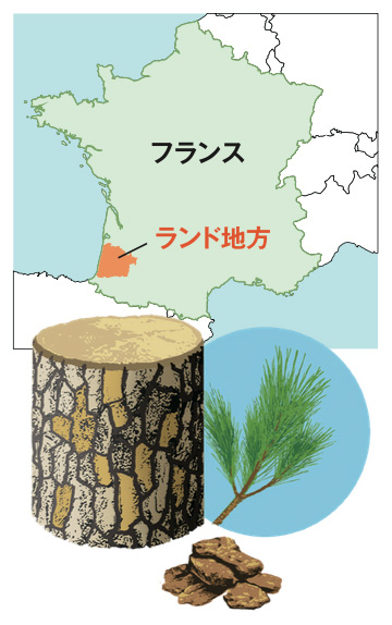 海岸松が生息するのは、フランス南西部のランド地方。ここは、年間を通じて強い日差しが照り付け、大西洋からの強風も吹く場所です。海岸松は自らの身を守るため樹皮を厚くしていて、その樹皮には、高い濃度でポリフェノールが含まれています。