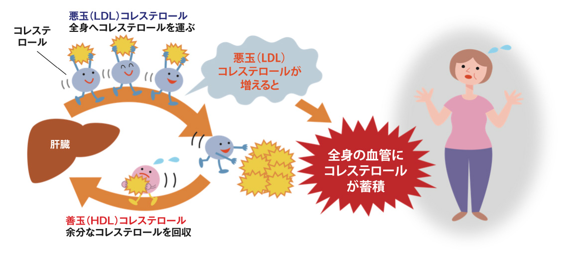 コレステロールは本来、体に必要な物質。私たちの体には、体内のコレステロール量を一定に保とうとする仕組みがあります。しかし、脂質の多い食事や加齢などによって悪玉(LDL)コレステロールが増えると、余分なコレステロールが回収されずに蓄積してしまいます。対策をとることなく放置していると、健康面でのリスクが大きくなってしまうため注意が必要です。