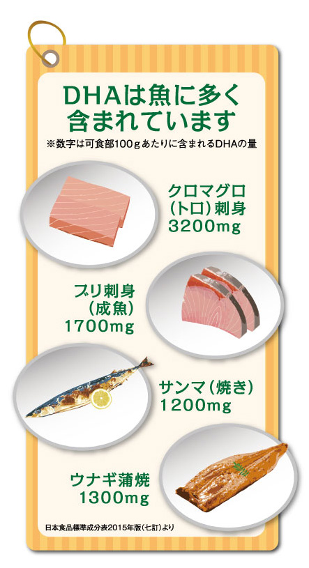 「魚を食べると頭が良くなる」といわれるのは、青魚やまぐろなどに豊富に含まれるDHAが、脳・神経の発達や機能維持に重要な役割を果たすとされているため。また、高齢者に多い眼の病気である加齢黄斑変性症の予防にも効果があることが分かっています。