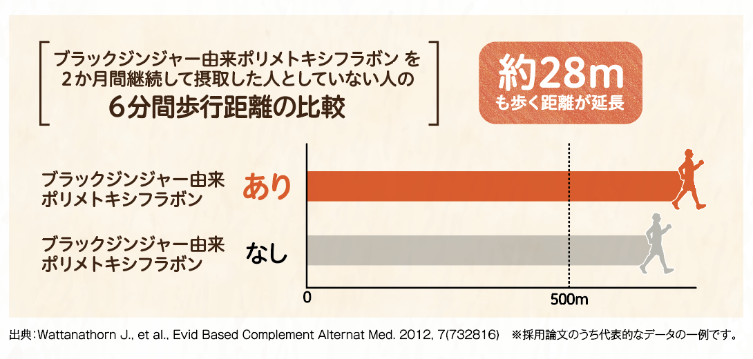 60歳以上の健康な男女45名を対象にブラックジンジャー由来ポリメトキシフラボン7.2㎎を配合した食品と非配合食品を2か月間連続して摂取してもらい、歩行能力の指標である6分間歩行テストで歩行距離を測定する実験を行いました。