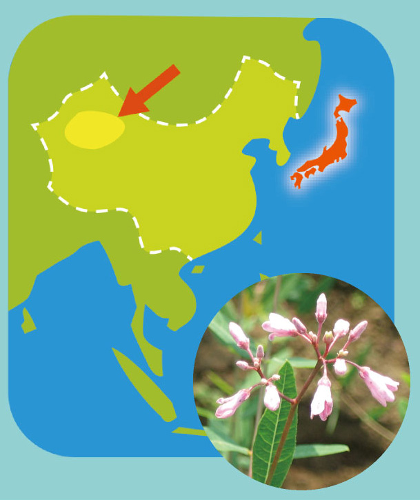 ラフマの故郷は、中央アジア・新疆ウイグル自治区のタリム盆地。乾燥した大地の水辺に育ち、草丈は1〜2m。現地では羅布麻、紅麻などと呼ばれ、葉からお茶を、茎からは糸を作って、昔から利用してきました。