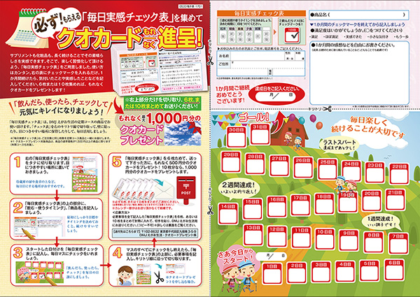 DMJえがお生活では、商品と一緒に「毎日実感チェック表」をお送りしています。飲んですぐにチェックマークを入れておくことで飲み忘れを防ぐことができ、1ヶ月ごとに満足度や感想を書いていただくこともできます。さらに、この表を6枚または10枚ためてお送りいただいた方には、もれなく割引特典もございます